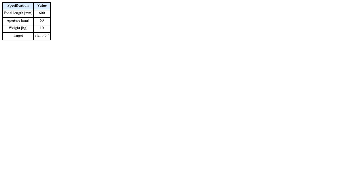 Table 1과 같다. 광학조립체 설계 MTF는 33 LPS/mm (나이키스트 주파수)에서 0.33 이다.