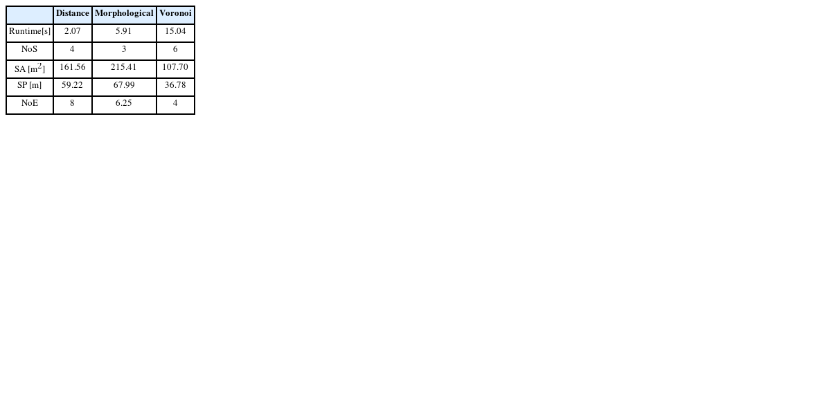 Table 1은 세 가지 알고리즘을 비교 분석한 결과이다. 비교 항목은 Runtime, NoS, SA, SP, NoE이다. 분석 결과, Distance Segmentation 방식이 가장 짧은 Runtime을 보였다. 그러나 NoS, SA, SP, NoE를 통한 정밀한 영역 분할 결과는 Voronoi Segmentation 방식이 가장 우수하였다.