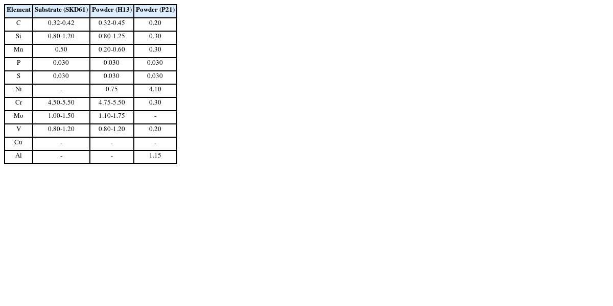 본 연구에서는 열간 금형 공구강인 SKD61을 보수를 위한 모재로 사용되었으며, 보수용 금속 분말로 열간 공구강인 H13과 사출 금형강인 P21을 사용하였다. H13 분말은 SKD61 소재와 거의 동일한 화학적 조성을 가지고 있으므로, SKD61의 동종소재 분말로 선정되었다[
