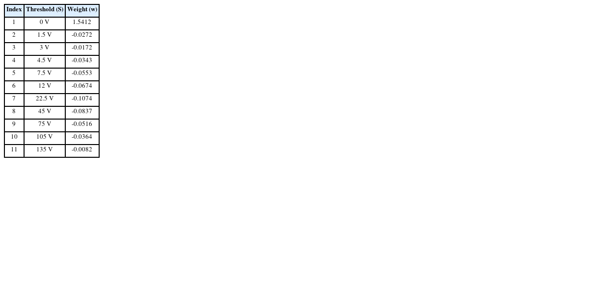 Table 2에 정리되었다. 본 연구에서 사용된 압전형 FSM의 경우 대칭적인 이력 곡선 특성을 보이므로 전압 증가 및 감소에 대해 동일한 임계값과 가중치가 사용된다. 식별된 PI모델을 이용한 이력 특성 보상 제어에 대한 결과는 다음 장에 기술되었다.