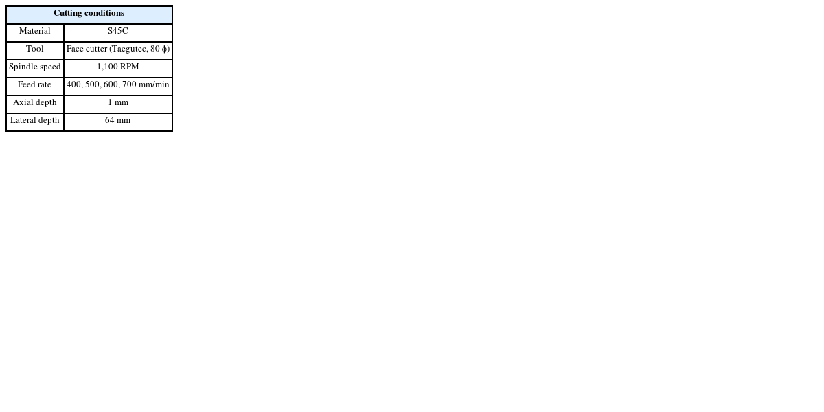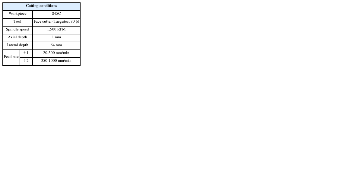 Table 3과 같이 절삭 조건을 구성하였으며, 2.1과 동일한 테스트베드에서 절삭 실험을 하였다. 주축 회전 속도는 장비 기저 속도인 1,500 RPM으로 고정하여 이송속도에만 변화를 주었는데, 20부터 300 까지는 20 mm/min씩, 300부터 1,000 까지는 50 mm/min씩 이송 속도를 증가시켰다.