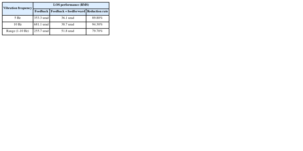 여기에 설계한 외란 피드포워드 제어기를 추가함에 따라 빨간색 실선에서 볼 수 있듯이 5와 10 Hz 외란에 대해서 모두 외란 억제 성능이 크게 향상된 것을 확인할 수 있다. 그에 따른 LOS 안정화 성능은 36.1, 38.7 urad (RMS)로 이미지 센서 기반 LOS 안정화 제어만 적용하였을 때보다 각각 89.8, 94.3% 향상된 성능을 보여주고 있으며, 그 결과는