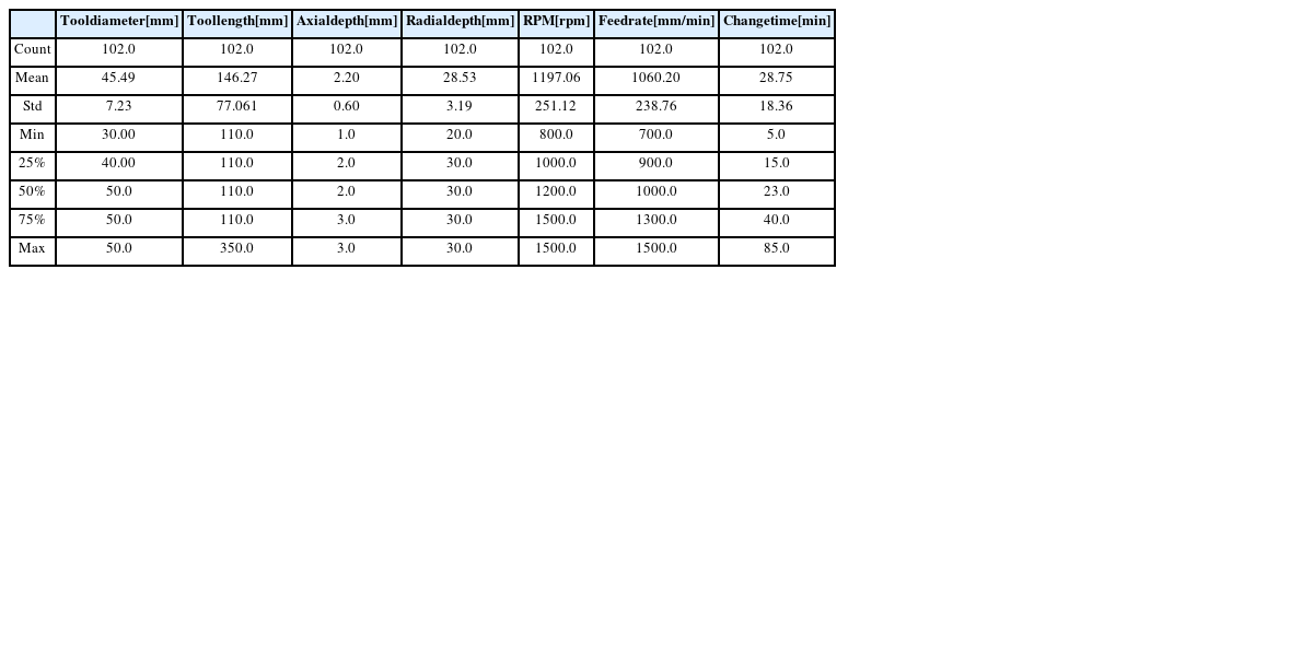 본 연구의 목표는 NC가공에 있어서 현장의 데이터를 축척해 이 데이터를 이용한 공수 수명을 예측하는 시스템을 개발하는 것이다. 기계가공에 있어서 가공환경은 범위가 너무 방대하기 때문에, 어느 정도 범위를 한정시킬 필요가 있다. 공구 수명이 특히 중요한 가공 공정 중 하나는 절삭량이 많은 황삭가공이며, 본 연구에서는 사출 금형의 황삭가공을 대상으로 공구 수명 예측 문제를 다룬다. 사출금형 황삭가공 현장에서는 파삭재 및 공구 소재는 크게 바꾸지 않고, 제품의 형상 크기에 따라 공구의 치수를 변경하여 가공하는 것이 일반적이다. 따라서 본 연구에서는 KP4M 소재를 초경 공구로 가공하는 업체에서 황삭가공 공정 중 작업자가 조정 가능한 공구 수명에 직접적인 영향을 미치는 공구 직경, 공구 길이, 축 방향 깊이, 반경방향 깊이, 회전수, 이송 속도를 주요 인자로 설정하고