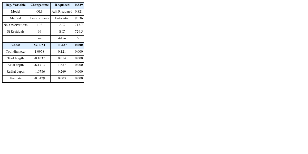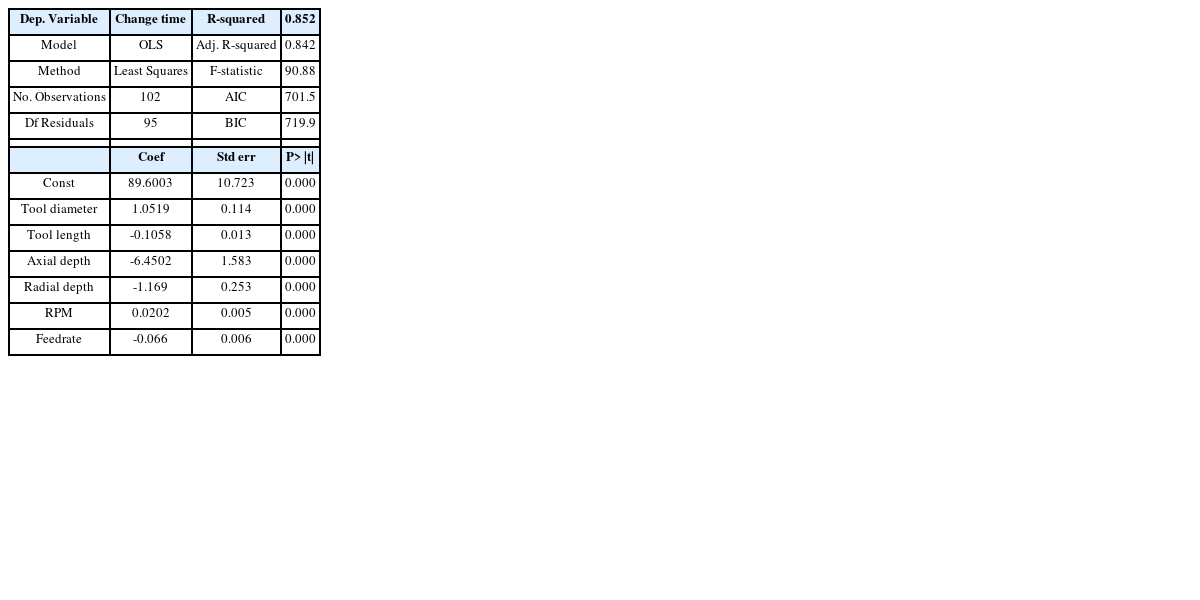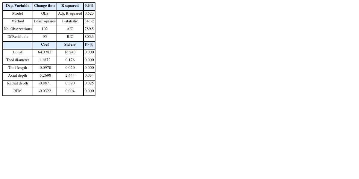 Table 2와 같다. 결정계수(R-squared) 값이 0.852로 비교적 높은 모델의 예측 성능을 확인할 수 있고, 인자들의 p value가 매우 낮아 유의미한 계수로 추정이 되지만, 회전수와 이송속도의 회귀 계수가 물리적인 관점에서 타당하지 않을 걸 확인할 수 있다. 두 변수는 강한 양의 상관관계를 갖고 있음에도 공구 수명에 회전수는 양의 방향으로 이송속도는 음의 방향으로 영향을 미치는 것으로 분석되어 모델의 예측 정확도를 신뢰하기 어렵다고 판단할 수 있다. 따라서 다중 공선성을 줄이고 예측 성능을 높이기 위한 회귀 모델을 구성하는 접근이 필요하다.
