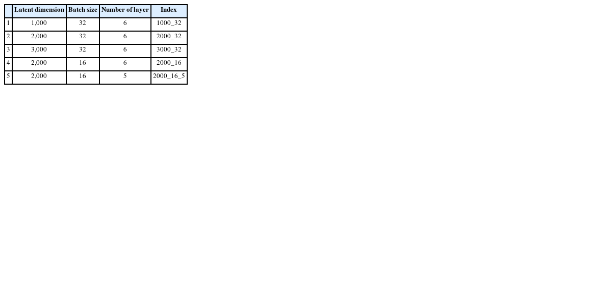 은닉층 수 6개, 생성자 차원 2,000 배치 크기 32의 기본 설정에서 MSE는 약 400 에포크에서 수렴하여 최종적으로 0.02에 도달하였다. 반면, 생성자 차원을 1,000 또는 3,000으로 변경한 경우, MSE의 수렴 속도가 느려지고, 최종 수렴값도 0.02보다 다소 높게 나타났다. 배치 크기를 16으로 줄였을 경우, 초기 학습 단계에서 MSE가 빠르게 감소하며, 최종적으로 0.008에 수렴하였다. 그러나 은닉층 수를 5로 줄인 경우, MSE의 수렴 속도가 저하되었고, 최종적으로 0.034의 값을 기록하였다.