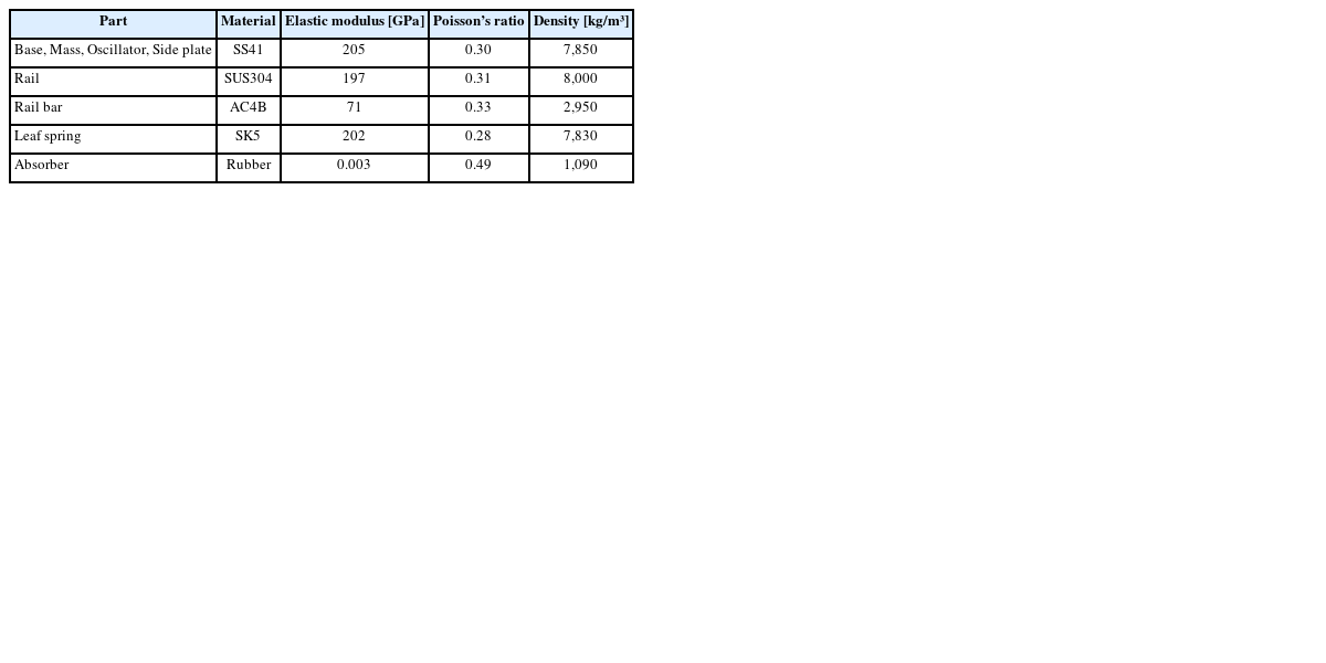 Table 1은 각 부품에 사용된 재료 물성치를 나타낸다. 이때 장치의 구조적 안정성을 확보하기 위해 Base Frame은 SS41강을 적용하였으며, 진동이 외부 시스템으로 전달되는 것을 저감하기 위해 고무 재질의 Absorber를 Base Frame과 상부 사이에 배치하였다.