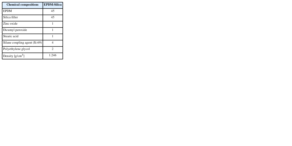 59]. 우리는 최대 100 MPa 수소 압력에서도 안정적으로 사용할 수 있는 고경도의 고무 시편 제작을 위해, Silica 필러를 다량 함유한 EPDM을 시험 소재로 선정하여 제작하였다. 제작된 소재의 화학적 조성과 밀도는