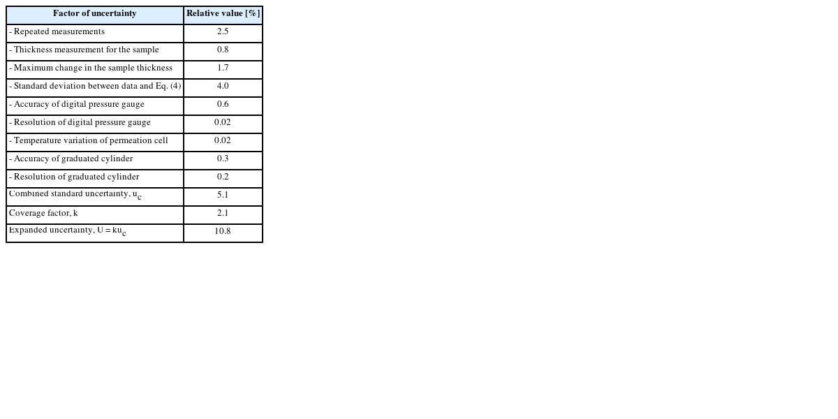 Table 1에 나타냈다. 투과 실험에는 직경 21.5 mm, 두께 2.0-4.0 mm의 디스크 형태 시편을 사용하였다.