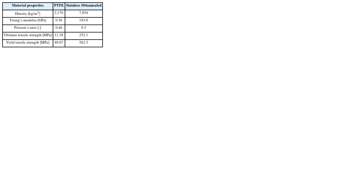 본 연구에 사용된 씰은 PTFE 소재로 제작하였다. 일반적으로 PTFE는 높은 내마모성을 가지고 있어 윤활제를 사용하지 않는 무윤활 플라스틱 씰에 적합하다. 따라서 무윤활 플라스틱 씰 소재 물성은 PTFE로 적용해 해석을 진행하였다. 또한 해석에 사용된 하우징 및 샤프트는 SUS 304를 사용하였고 세부 소재 특성은