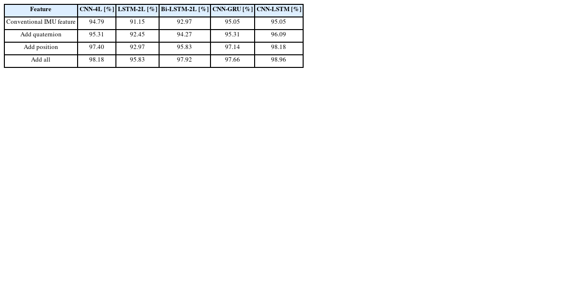 모든 모델에서 위치 특징과 쿼터니언 특징을 동시에 추가할 때 평균 정확도 증가율은 3-4%로 가장 높은 정확도 증가율을 보였다. 특히 두 가지 다른 아키텍처를 결합한 모델이 여러 레이어를 사용하는 단일 모델에 비해 더 높은 정확도를 보였다. 5가지 모델 중 모든 기능을 통합했을 때 가장 높은 정확도를 보인 모델은 CNN-LSTM이었다. 모든 기능을 통합했을 때 가장 높은 정확도를 보여 행동 정확도 분석에 최적화된 모델로 선정하였다.