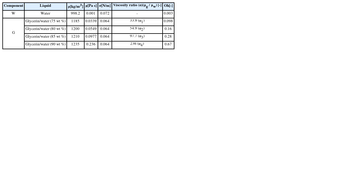 Table 1에 나타냈으며, G 성분은 서로 다른 중량비를 가지는 글리세린/물 혼합물로 구성되었다. W 및 G 성분 모두에 대해 정적 접촉각은 160°로 설정하였는데, 이는 전진각과 후퇴각이 유사하며 접촉각 이력이 4° 이하인 조건을 반영한 것이다.