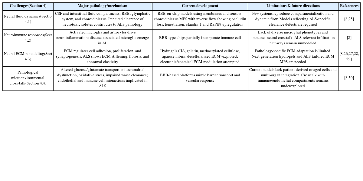 Table 1과 같이 신경조직 내 유체 유동과 이에 기반한 병원성 물질 및 치료 인자의 이동, 뇌, 척수, 상위 운동 뉴런, 하위 운동 뉴런, 근육, 뇌와 척수의 혈액 장벽, 이외 신경 및 근조직에 대한 혈관화 시스템, 림프계, 신경 특이적 면역 체계 등을 재현한 시스템이 고려될 수 있으며, 후보 신약 또는 세포치료제 등의 약리학적, 약물동태학적, 약물동역학적 분석과 검증 병행이 필요하다.
