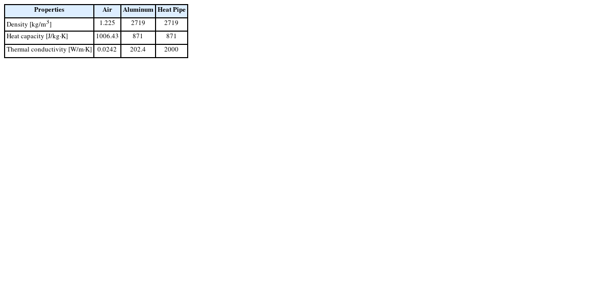 11]. 내, 외부 시스템으로 유입되는 고온 유체 및 냉각 유체의 물성치는 모두 Fluent Database 내의 상온 공기 물성치를 적용하였다. 열교환기 구성 요소 중 PHP를 제외한 모든 부품에는 열전도도 202.4 W/m·K를 갖는 알루미늄의 물성치를 부여하였다. PHP에는 알루미늄과 동일한 물성치를 적용하되, 열전도도는 2,000 W/m·K로 설정하였다. 이는 동일 체적 내에서의 열전달 효율 향상의 목적을 가진다. 시스템 내 적용된 재료의 물성치는