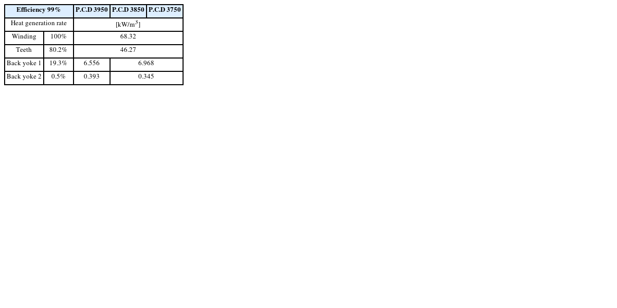 본 연구에서의 전동기 성능은 효율이 99%일 때, 손실 1%에 대한 발열량을 각 요소별 권선에서만 발생하는 동손과 고정자에서 발생되는 철손에 의한 발열량을 계산하여