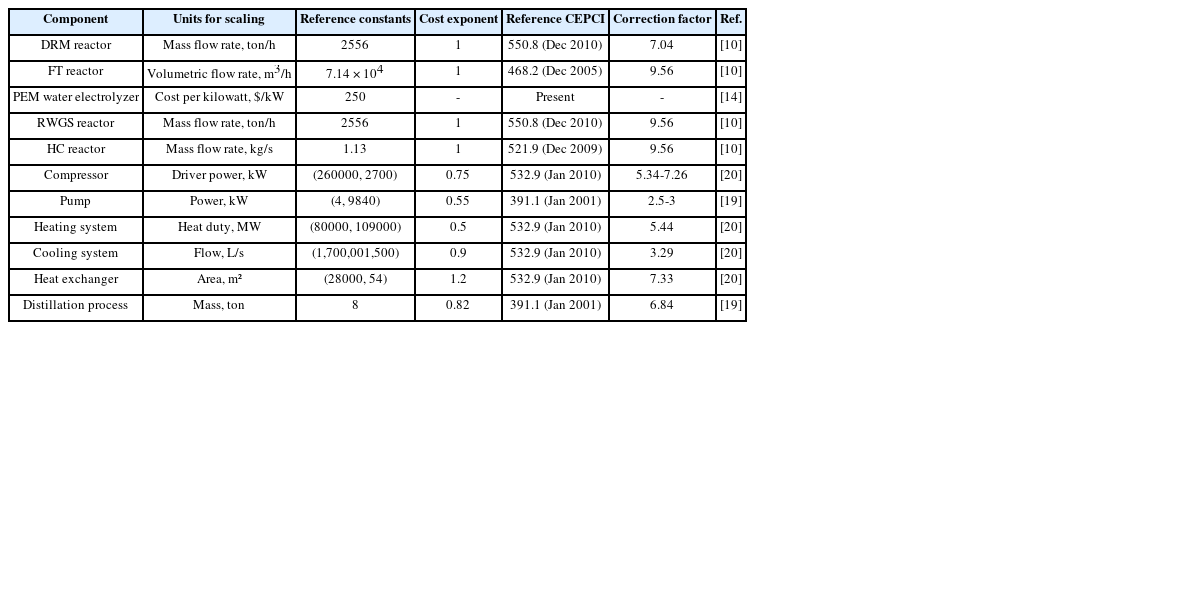 Table 1에 정리되어 있다. 가장 큰 부분을 차지하는 TPC (Total Purchase Cost)는 설비별 구매 비용(Purchase Cost, PC)를 모두 합한 비용이다. Off-site Cost란 부지 정비, 유틸리티, 건설 등에 소모되는 비용이다. Indirect Cost는 공사비, 설계비, 예비비를 포함하는 개념이다. 마지막으로 Working Capital은 초기 가동 비용으로 재고 및 초기 운전 자본을 포함한다. TPC를 계산하기 위해 설비별 PC를 계산한 방법은 식(4)-식(6) 및