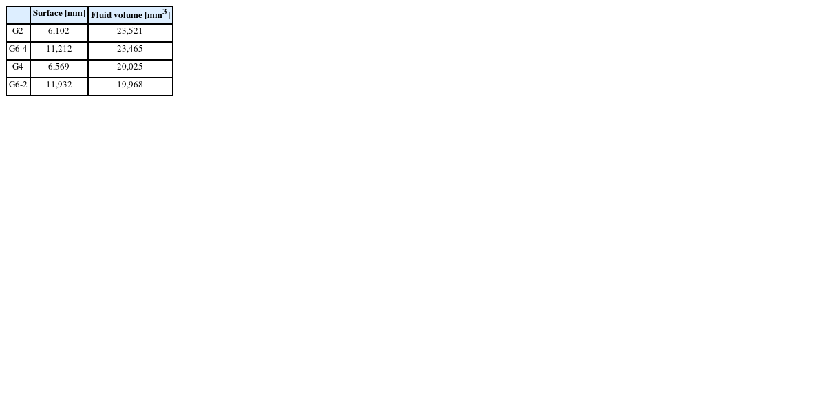 G2와 G6-4의 경우 동일한 유체체적을 보유하지만 G6-4의 표면적이 1.8배 넓은 것을 확인하였으며, G4와 G6-2 역시 동일한 유체체적임에도 G6-2의 표면적이 1.9배 크다는 것을 확인하였다. 이를 통해 이중격벽 구조가 단일격벽과 동일한 유체체적임에도 표면적을 효과적으로 확장시킬 수 있음을 증명하였다.