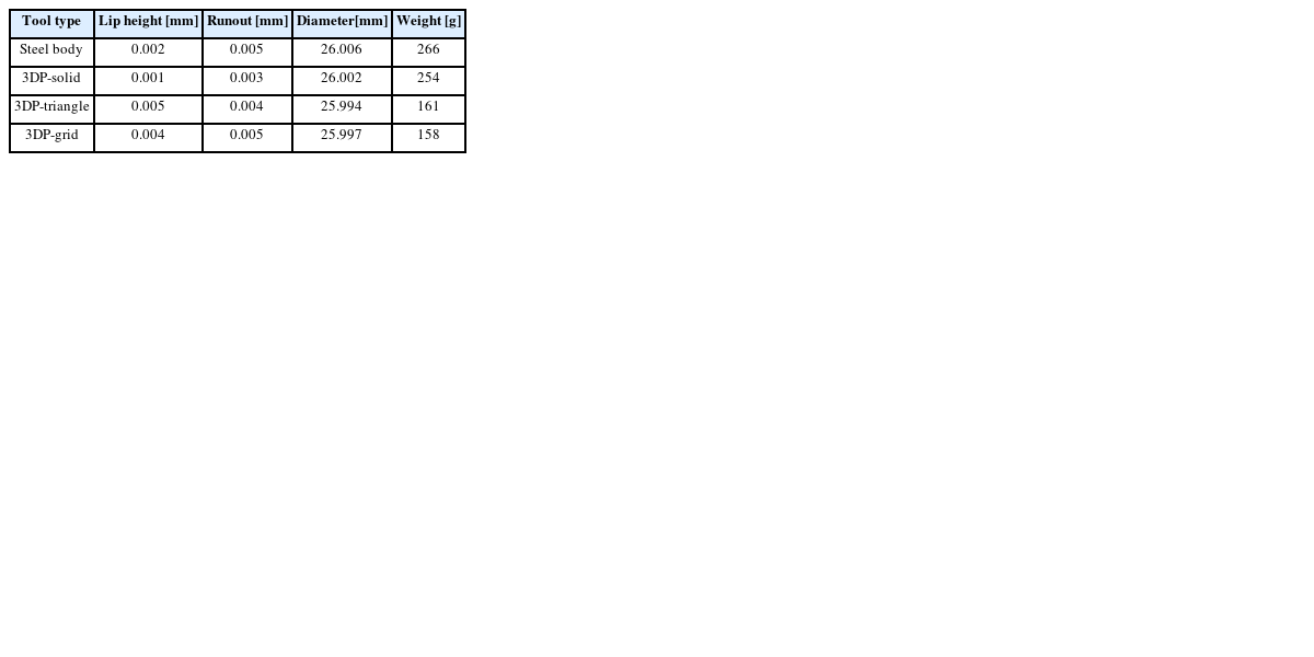 Table 3에 나타내었다. 측정한 값은 Lip height 및 Runout 그리고 직경이며, 4가지 PCD 보링 공구에 대해 서로 차이가 나타나지 않은 것을 확인할 수 있었다. 또한 전자저울(WK-4C, CAS, Korea)을 통해 PCD 보링 공구의 무게를 측정하였다. 공구 무게는 기존 선반/밀링 방식의 Steel 공구가 높게 나타났다. 적층 공구에서는 내부 구조가 가득 찬 Solid 공구가 높게 나타났으며, 적층 내부 구조 형상에 따라 무게가 달라지는 것을 확인할 수 있었다.