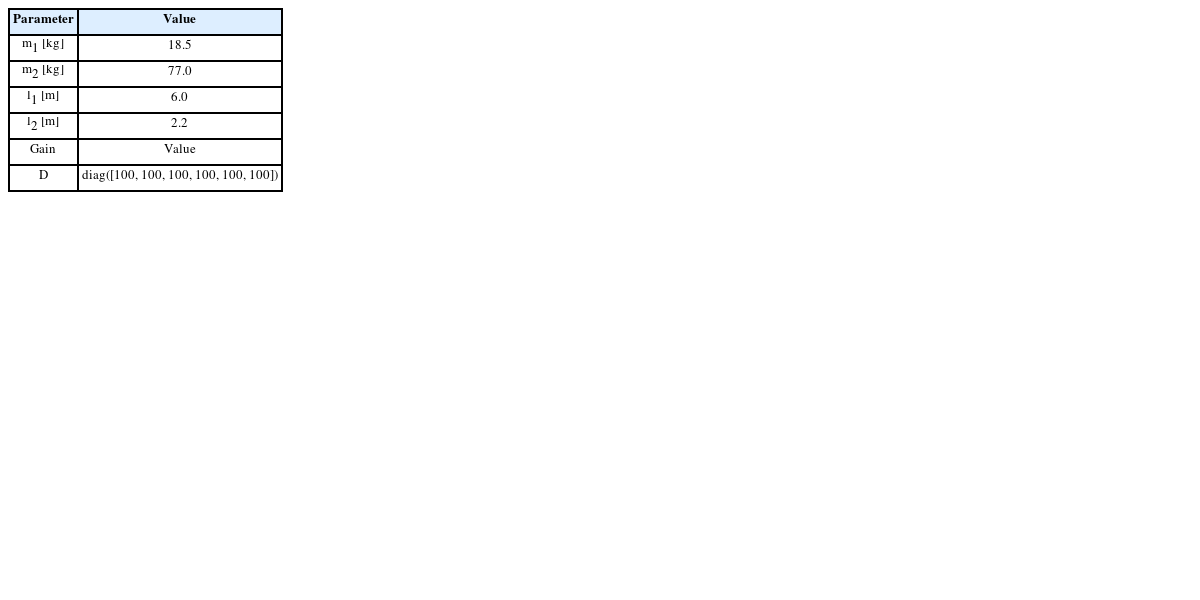 T를 초기값으로 한 뒤 시뮬레이션을 수행하였다. 이 때, 시스템은 중력에 의해 유도된 초기 진자 운동을 시작으로, 추진 시스템의 추력에 의해 점차 감쇠되는 움직임을 보이게 된다. 사용된 파라미터 값과 감쇠 행렬은