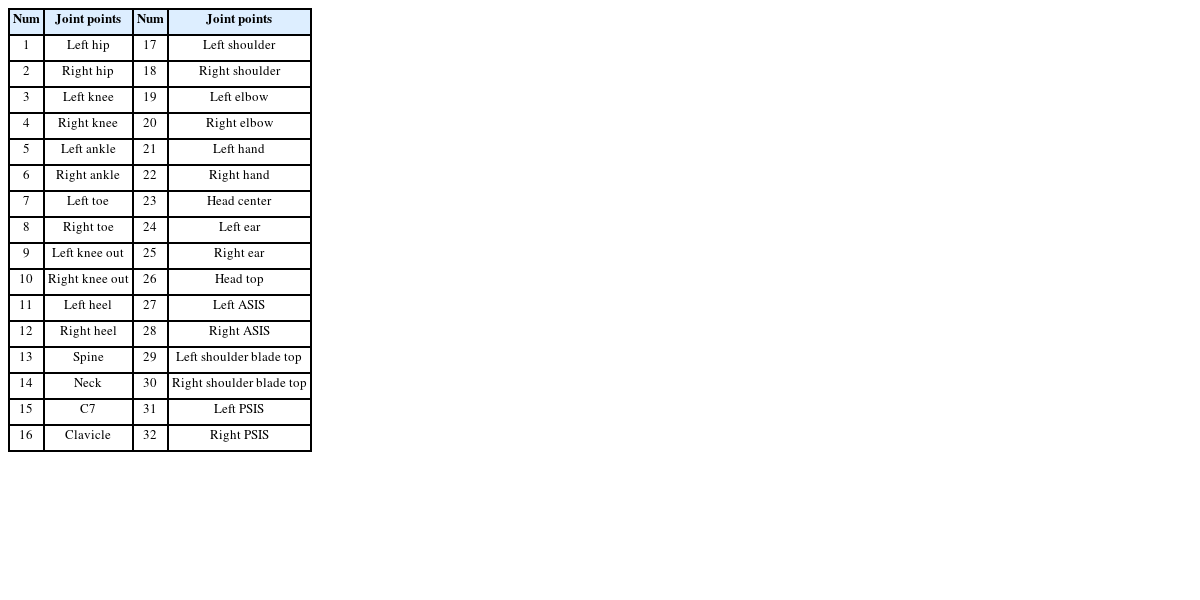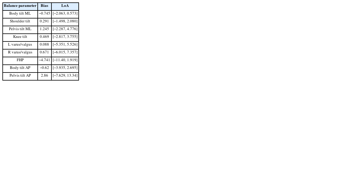 Table 1은 Vicon Nexus 1.8.5 내부 연산에 사용된 피험자의 인체 계측 정보를 보여준다. 반사 마커 부착 후, 각 피험자 계측 정보를 활용해 시스템 연산에 따라 LHUP (Left Humerus Proximal)와 RHUP (Right Humerus Proximal), FEP (Femur Proximal)와 FEO (Femur Origin), FEO와 TIO (Tibia Origin)의 6개의 관절 포인트가 추가로 계산되었다. 수평면은 Horizontal Plane (HP, XY-plane), 수직면은 Vertical Plane (VP, XZ-Plane, YZ-Plane)로 정의한다. 아래와 같은 방식으로 신체 균형 지표를 계산한다[