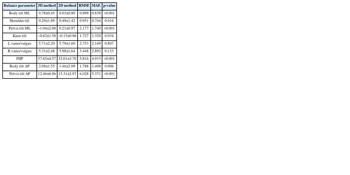 본 연구에서는 휴대폰 카메라로 촬영한 2D 이미지를 기반으로 9개의 신체 균형 지표(전신 좌우 기울기, 어깨 기울기, 골반 좌우 기울기, 무릎 기울기, 내반슬 및 외반슬, 거북목 각도, 전신 앞뒤 기울기, 골반 앞뒤 기울기)를 측정하고, 이를 3D 동작 분석 시스템의 결과와 정량적으로 비교하였다. 특히 RMSE [