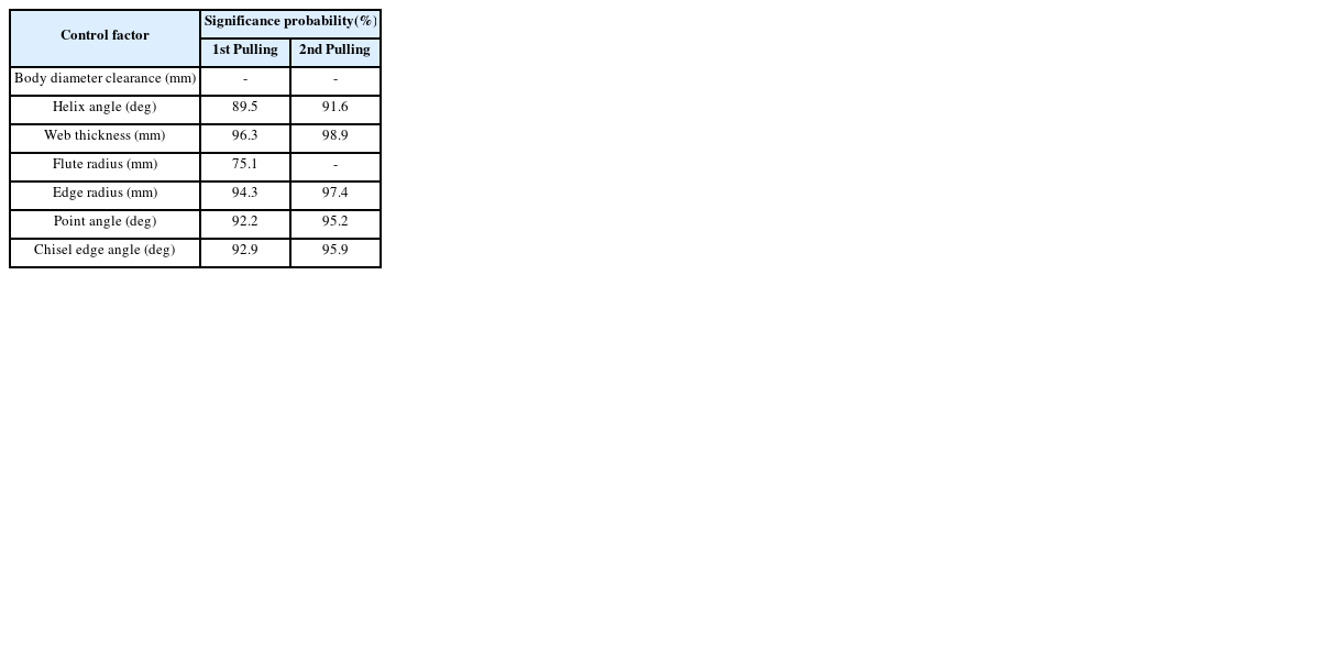 (2) 실험계획법을 적용하여 드릴의 형상을 7가지 인자 2수준으로 해석을 수행하였고, 해석 결과의 S/N비 분석을 통해 드릴의 형상이 추력과 절삭온도에 미치는 영향을 파악하였고, 분산분석을 실시하여 유의확률이 95%이상 인 유의인자를 선정하였다.