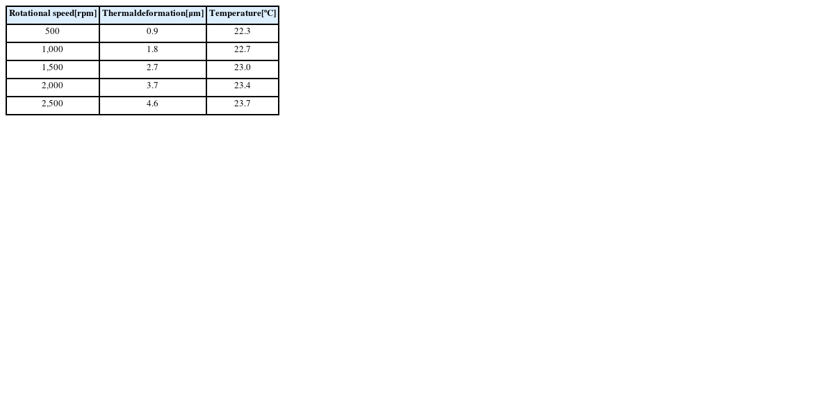 선회형 모듈의 회전에 따라 가공정밀도에 영향을 미치는 주요 부위의 발열범위를 파악하기 위하여, 회전속도를 500 rpm 부터 2,500 rpm까지 구간별로 500 rpm을 증가시켜 열해석을 수행하였다. 열해석은
