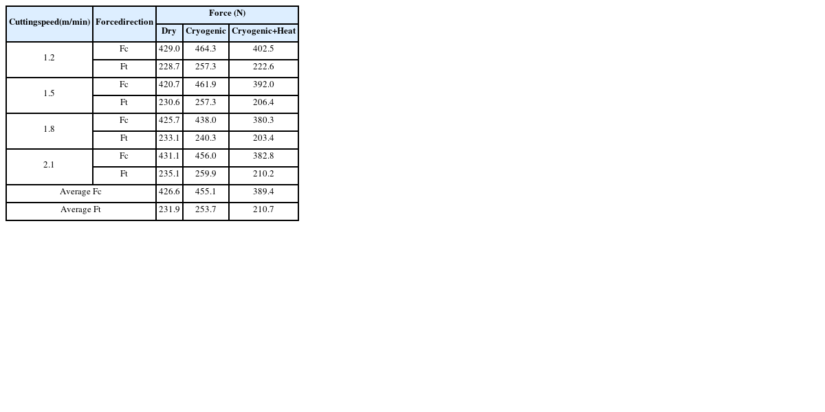 절삭 부하의 감소는 공구 마모를 감소시키는 요인 중 하나이다. 따라서 Ti-6Al-4V 소재 절삭 가공 시 공구 수명 향상을 위해, ‘극저온 + 소재 가열’ 조건에서 해당 공정을 수행하는 것이 유리할 것으로 판단된다.