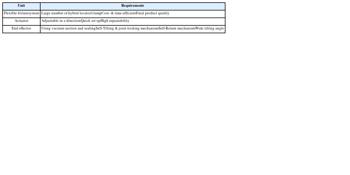 Table 1Requirements of flexible fixture systems