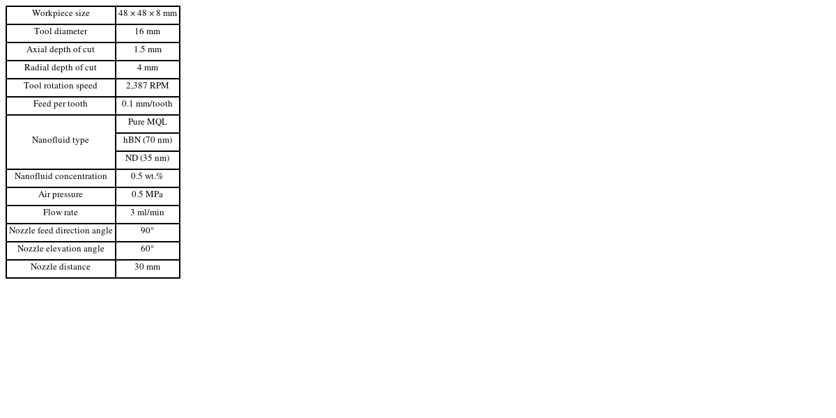 노즐에서 분사되는 유체는 Pure MQL의 경우 공기와 순정오일, 나노유체 MQL의 경우 공기와 각각 0.5 wt.%의 농도를 갖는 hBN 나노유체 및 ND 나노유체이다. 이 때 Pure MQL은 나오미테크사의 순정오일을 사용하였고 hBN 및 ND 나노입자는 각각 XG-Science, 링크코리아 사 제품이다.