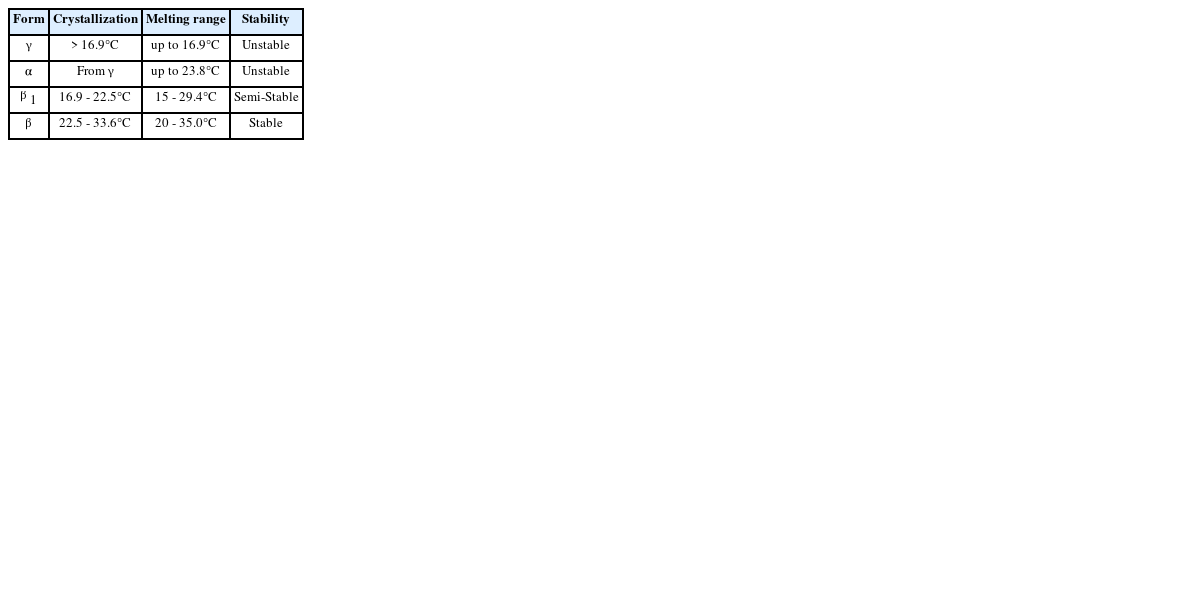 초콜릿 재료의 주성분인 코코아 버터는 다수개의 결정화 지점(Crystallization Points)을 내포하고 있으며, 이러한 다형성 결정화 특성(Polymorphic Form)은