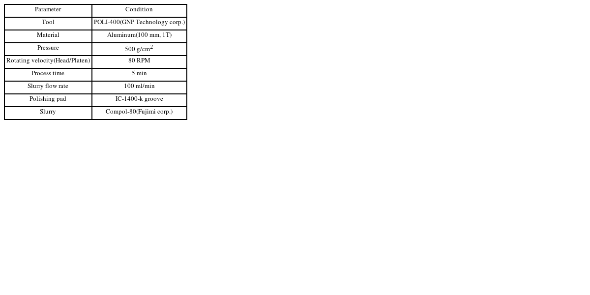 먼저 착화제의 종류가 알루미늄 CMP 결과에 미치는 영향을 확인하기 위해 착화제와 슬러리를 혼합하여 연마 실험을 실시하였다. 3종의 착화제 중 연마율이 높은 착화제를 선택하였으며, 이를 이용하여 과산화수소 함량에 따른 연마율 및 표면거칠기의 변화도 조사하였다. 마지막으로 큰 효과가 나타난 옥살산의 함량을 조절하여 알루미늄 CMP에 적합한 슬러리의 조성을 확인하였다. 알루미늄 CMP의 실험조건은 아래와 같다.