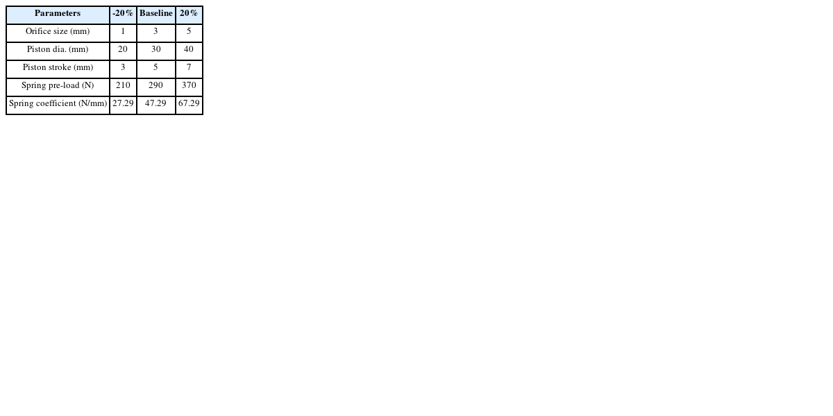 Fig. 1에 표시한 것과 같이 ①유압 피스톤의 오리피스 크기, ②유압 피스톤의 지름, ③유압 피스톤의 행정거리, ④리턴 스프링의 예압력과 ⑤스프링 상수로 선정하였다.