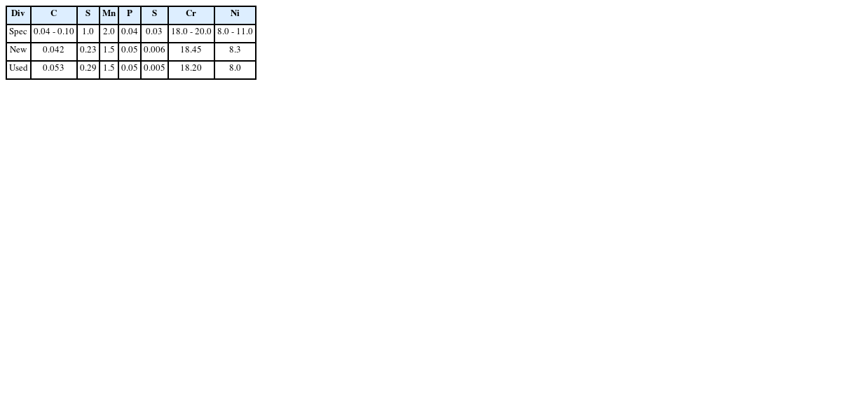 STS304H Tube는 기존의 STS304 (18Cr-8Ni) 소재에 고온강도를 향상시키기 위해 탄소(Carbon) 양을 증가시켜 개량화한 소재이다. 시험에 사용된 304H Tube의 규격은 직경 63.5 mm, 두께 5.5 mm이다. 또한, 분광분석기를 통한 시험대상 튜브의 화학 조성 분석 결과는