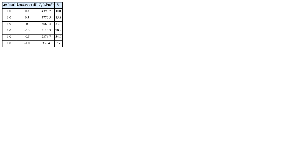 특히 압축하중이 작용하는 경우에는 하중비가 감소함에 따라 급격하게 파괴저항곡선이 낮아지는 것을 확인할 수 있었으며, 하중비가 -1.0인 경우는 하중비가 0.8인 경우에 비해 7.7% 수준의 아주 낮은 파괴저항곡선을 나타내었다.