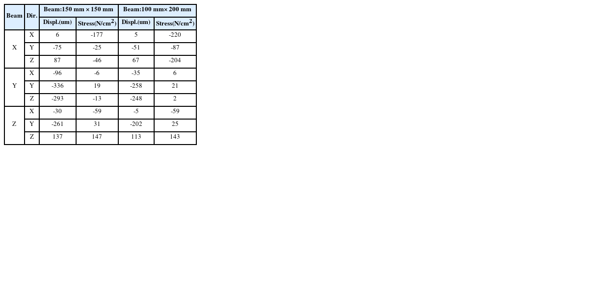 최대변위는 X축 빔의 경우 빔의 크기가 100 mm × 200 mm인 경우, X축 빔의 X방향 변위는 15 um, Y방향 변위는 152 um, Z방향 변위는 23 um적고, Y축 빔의 X방향 변위는 50 um, Y방향 변위는 116 um, Z방향 변위는 22 um적으며, Z축 빔의 X방향 변위는 94 um, Y방향 변위는 118 um, Z방향 변위는 26 um적게 나타났다.