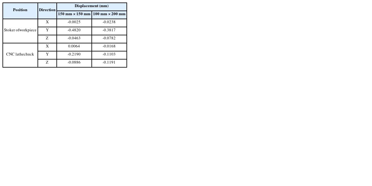 Table 2Maximum displacement and maximum stress (CNC lathe chuck position: X = 256 mm, Y = 723 mm, Z = 577 mm)