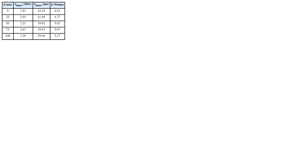 d (μm) σmax (MPa) δmax (μm) k (N/mm)