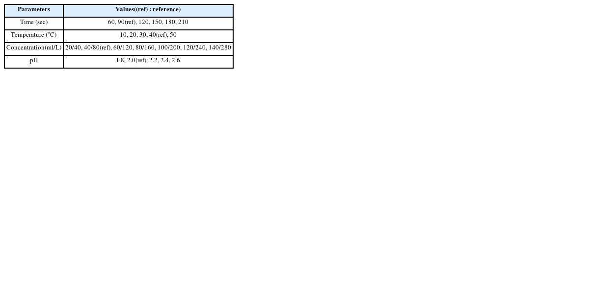 본 연구에서 개발된 부상압력 방식의 도금장치에서 최적 도금 조건을 파악하기 위한 실험조건은 Table 1과 같다. 이 실험조건들을 조합하여 통계적인 유의성을 갖는 실험을 수행하려면 수 많은 실험이 필요하다. 그러나 개발된 부상압력을 이용한 도금방식의 유효성을 검증하는 것이 본 연구의 주요 목적이므로 실험횟수를 줄이기 위하여 다음과 같은 실험방식을 선택하였다. 예를 들면, 하나의 실험 매개변수를 변화시킬 때 나머지 실험 매개변수는 동일한 값을 이용하는 것이다. 이 때 침적시간, 온도, 농도, pH의 실험조건은 도금용액 제조사의 권장 값(Reference Value: 90 sec, 40°C, 40 : 80 ml/L, pH 2.0)을 기준으로 Table 1과 같이 변화시켰다. 단, Table 1을 이용한 실험은 샘플이 자유롭게 부상될 수 있는 50 kN/m2의 압력을 적용하였다.