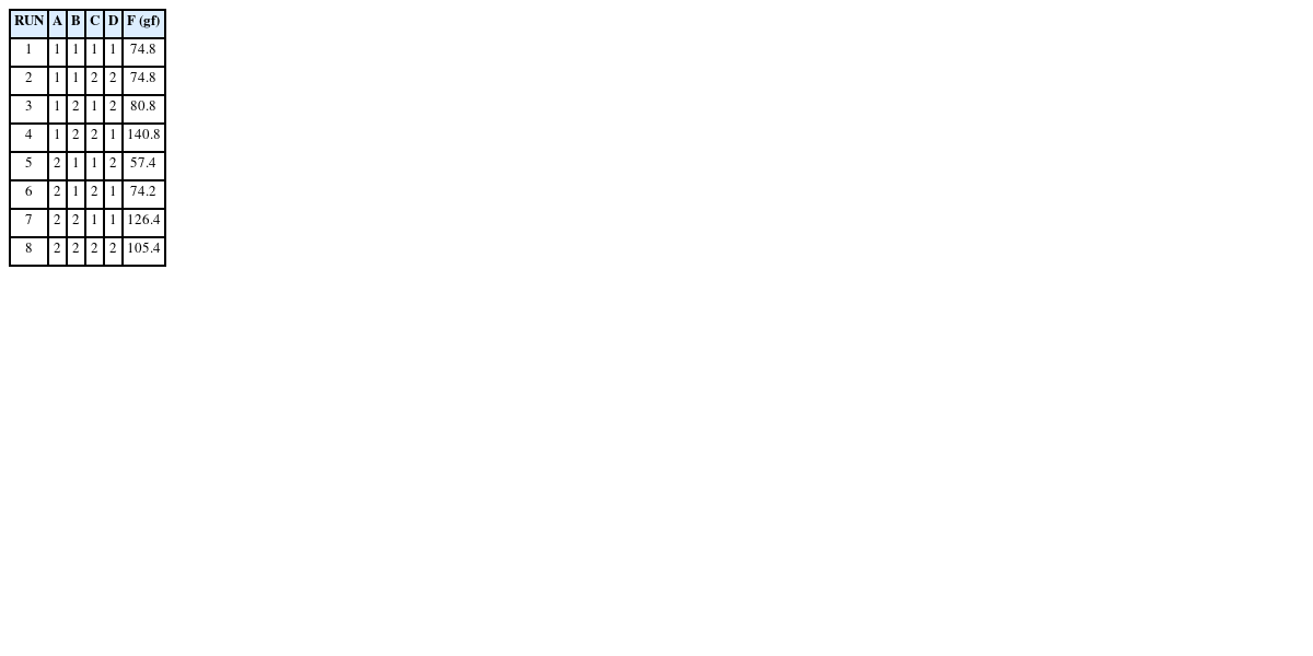 Table 12수준 값들에 대하여 Taguchi 실험계획법6을 수행하였다. L8직교 배열표를 사용하였고 교호작용을 배제하기 위하여 1, 2, 4, 7번 컬럼을 사용하였다. 끌어당기는 힘(F) 측정방법으로 푸시풀 게이지(Push-Pull Gauge)를 사용하였고 총 10회 반복 측정에 대한 평균값을 얻었다.