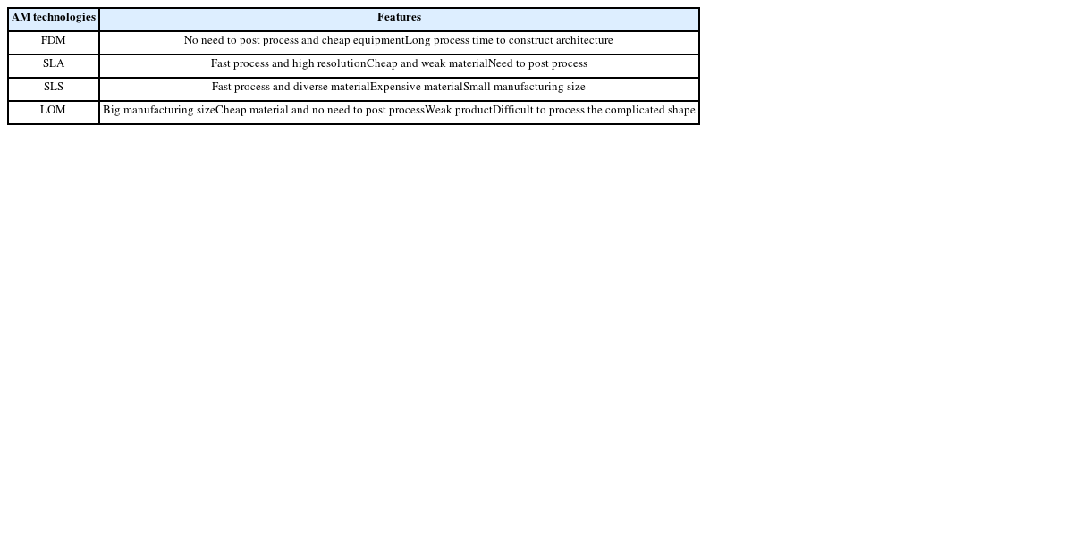 Fig. 1에 AM 기술이 건축에 적용되었을 때 AM 기술의 해상도와 적층 속도의 상관관계를 나타내었다.
