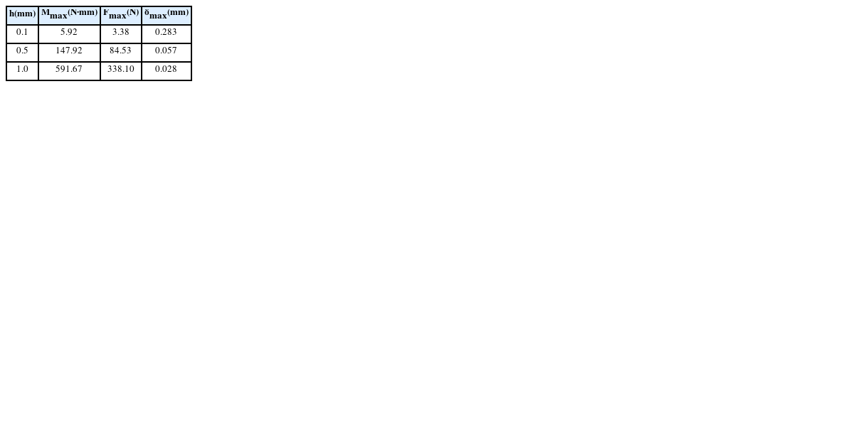 식(2)와 같이 표현된다. 시편의 재질은 HASTELLOY C-276 인데 니켈-크롬-몰리브뎀 합금으로 내환경성, 내부식성이 뛰어나서 극한 환경의 부품에 널리 사용되며, 탄성계수(E) 205GPa이다. 시편의 단면형상이 폭(b) 10 mm, 두께(h) 0.1/0.5 mm, 길이(L) 14 mm 일 때 이론