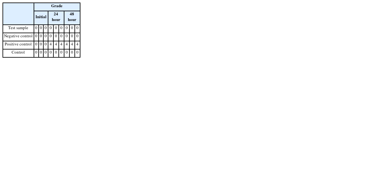 7 음성대조군이 0등급, 양성대조군이 4등급 이상일 경우, 시험상태가 적합한 것으로 판단하였다. 시험물질을 관찰한 결과, 판정 등급이 2이하일 경우, 시험물질에 세포독성이 없는 것으로 판정하였다. 그 결과,