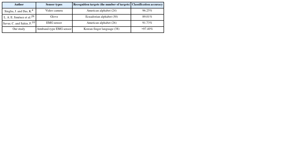 10은 본 연구와 유사하게 인공신경망 분류기와 다채널 표면 근전도를 이용하여 26가지 지화 동작을 분류하였으나, 단일 분류기를 적용한 선행 알고리즘은 앙상블 인공신경망보다 분류 정확도가 낮았다.