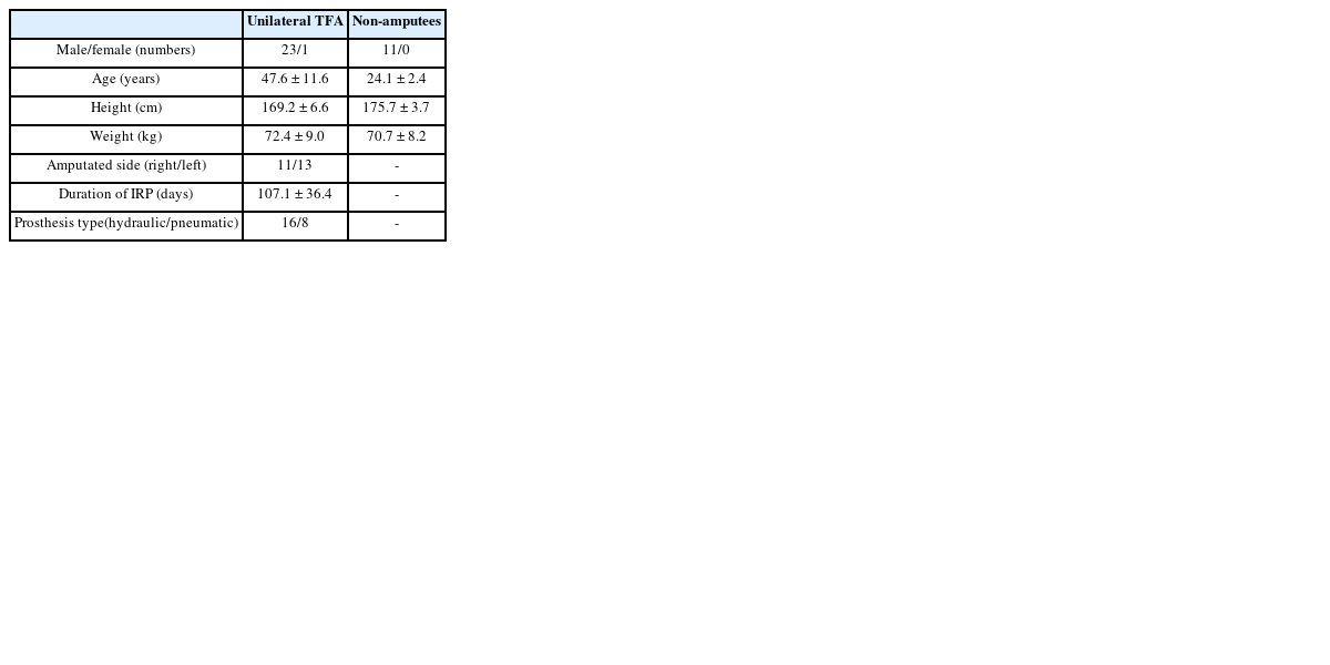 Table 1과 같다. 또한, 하지절단자의 보행특성을 파악하고자 정상성인 남성 11명의 보행 분석 데이터를 대조군으로 사용하였다. 본 연구는 근로복지공단 재활공학연구소 연구윤리심의 위원회의 사전승인을 받아 진행되었다(RERI-IRB-20170131-1).