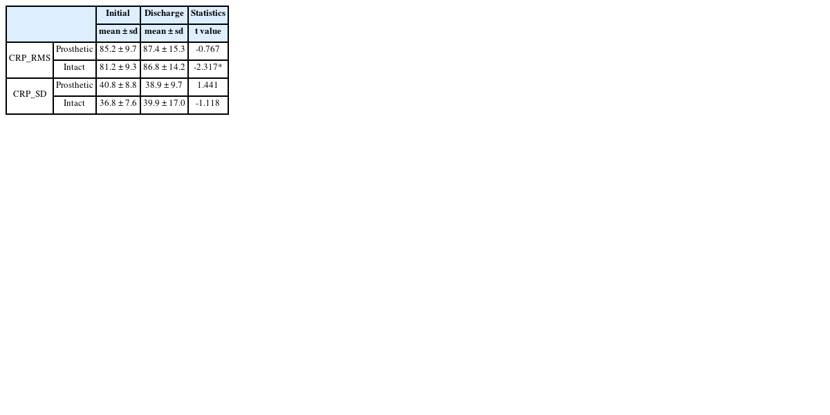 12 본 연구에서 환측과 건측의 CRP_RMS 값은 훈련 후 모두 증가하였으며, CRP_SD는 의지측은 감소하고 건측은 증가하는 경향을 보였다. 또한 훈련 후에도 여전히 정상군보다 In-Phase 형태를 보이면서 통계적으로도 유의한 차이가 있음을 확인하였다.
