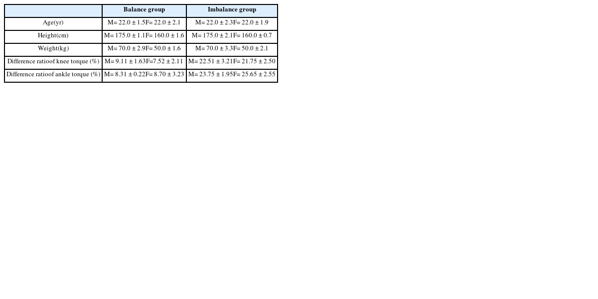 본 연구에서는 하지의 근력 불균형에 따른 보행특성을 알아보기 위해 신체 건강한 20대 성인 남녀 100명을 대상으로 BIODEX System 3 (Biodex Medical Systems, Inc., USA)을 이용하여 등속성 관절토크를 평가하였다(