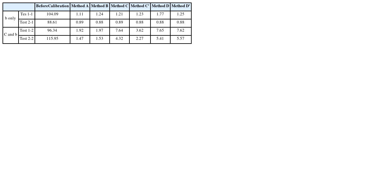 Table 1 참조). Method A를 제외한 나머지는 비선형 방정식을 풀어내야 하므로, Newton법 등과 같이 사용자가 지정하는 초기값에서 반복수정을 거치면 해를 구한다(Iterative Approach). 따라서, 지정된 초기값에 따라 수렴속도와 해에 많은 차이가 발생할 소지가 있다. 반면, Method A는 초기값 지정이 필요없는 선형해석과정을 통해 해가 도출되므로 해석속도는 물론이고, 해의 일관성과 정확성에서 보다 우수하다고 할 수 있다. 또한 보정 파라미터의 개수를 보면 Method B는 12개이고 나머지 방법들은 9개로 동일하지만, 고려되는 오차의 종류를 감안하면 Method A만 모든 오차를 고려하면서도 파라미터 개수가 9개인 것을 확인할 수 있다.