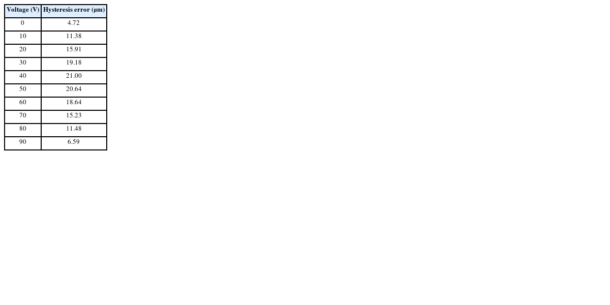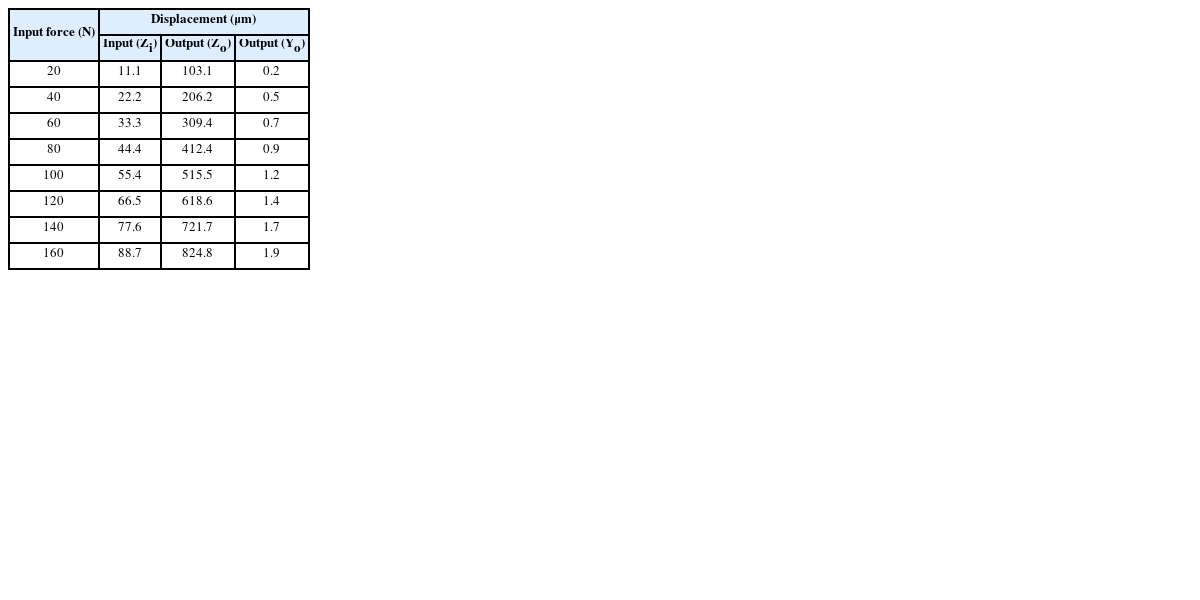 Table 1FEM displacement results of Al flexure hinge with notch thickness of 0.8 mm along with applied input forces (Zo = 9.30 * Zi + 0.50)