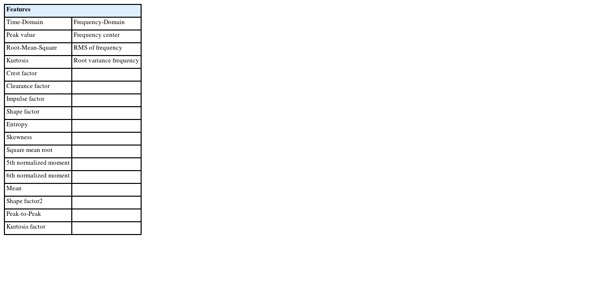Table 2와 같이 시간 영역과 주파수 영역의 특징들을 추출하였다. GA 기반 특징 선택은 각 클래스 내의 밀도와 클래스 간의 평균 거리를 목적 함수로 설정하였으며, 분류 성능이 좋은 3개의 특징을 선택하였다.