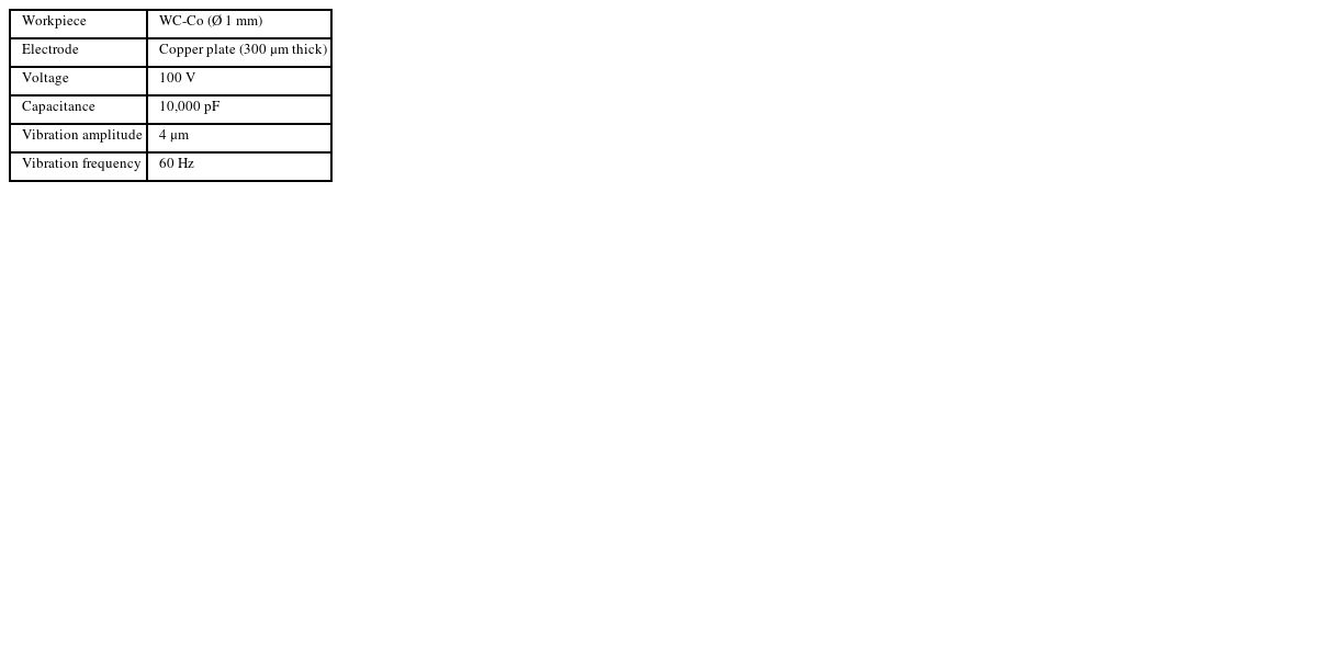 Fig. 6는 역방전으로 가공한 초경합금(WC-Co)재료의 편심공구 전극을 보이고 있다. 실린더형 공구 4개를 회전중심에서 150 μm 만큼 떨어진 지점에 가공하였다. 방전가공으로 구리판에 4개의 구멍을 가공한 뒤 역방전으로 공구를 제작하였다. 또한 가공효율을 향상시키기 위해 구리판에 진동을 부가하였으며